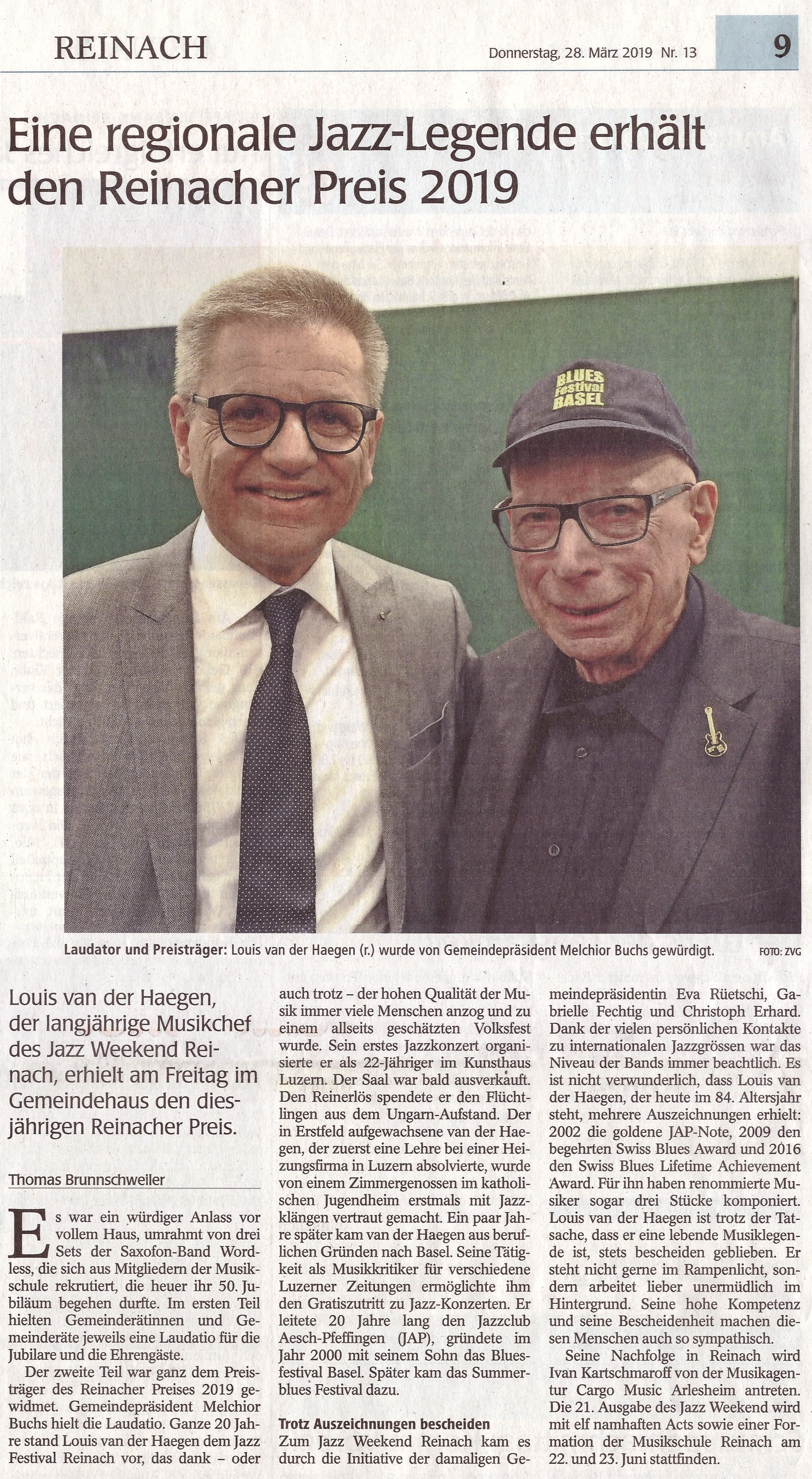 Louis van der Haegen, der langjährige Musikchef des Jazz Weekend Reinach, erhielt am Freitag im Gemeindehaus den diesjährigen Reinacher Preis.